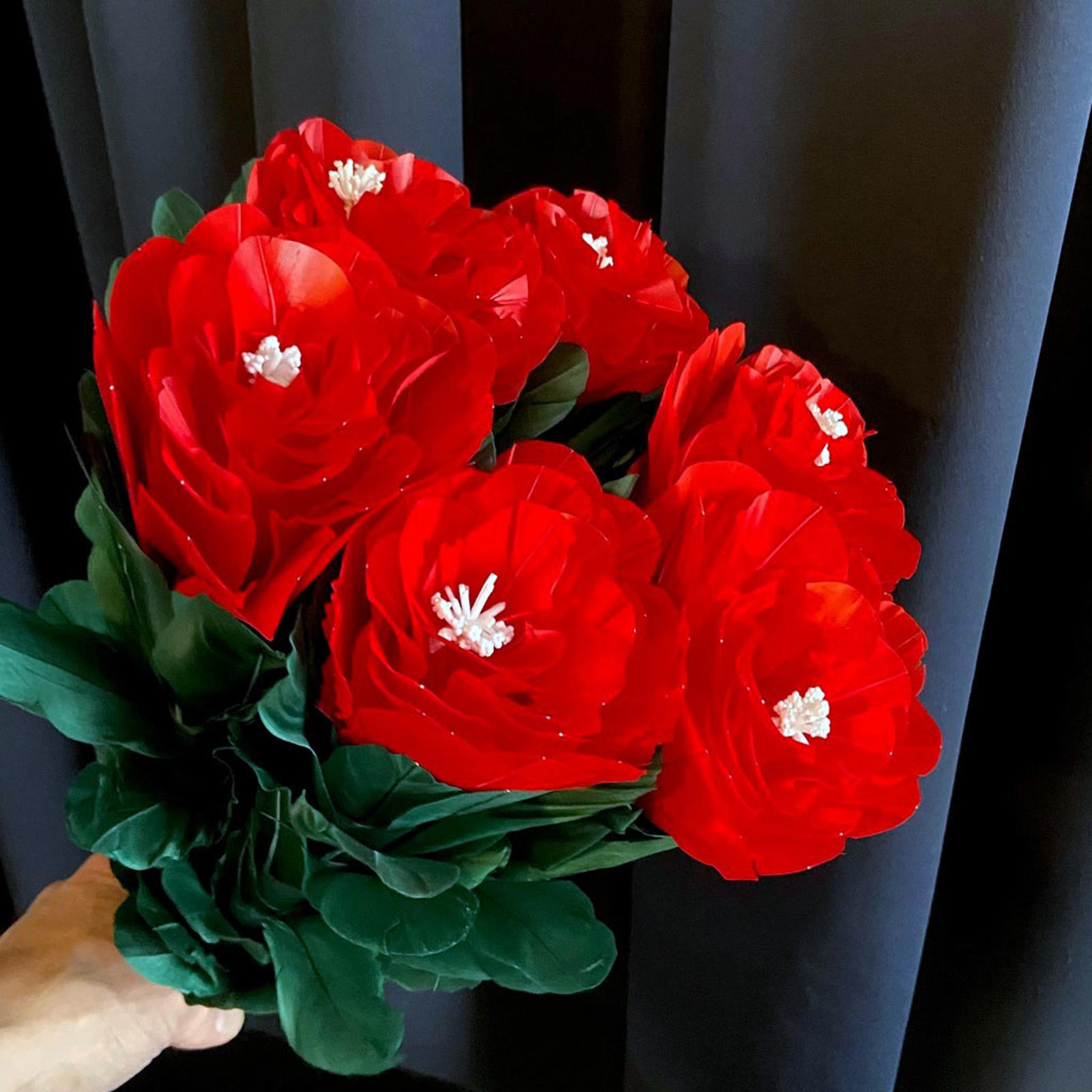 Du modtager en stor og flot speciallavet buket fjerblomster (50 cm. lang) med seks røde blomster i super fin kvalitet (som du ser på fotoene).