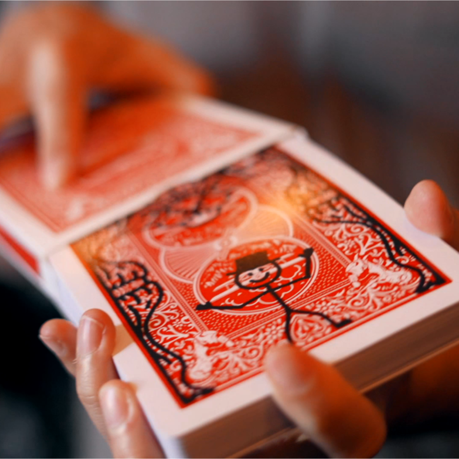 Du introducerer et spil jumbo kort med tegninger på bagsiden. Tegningerne viser en sjov lille tændstikmand, der står på en scene. Hvert kort i spillet er ændret en lille smule, så når du rifler igennem det, bevæger figuren sig som i en tegnefilm. Sjovt og sødt - og nu til magien...
