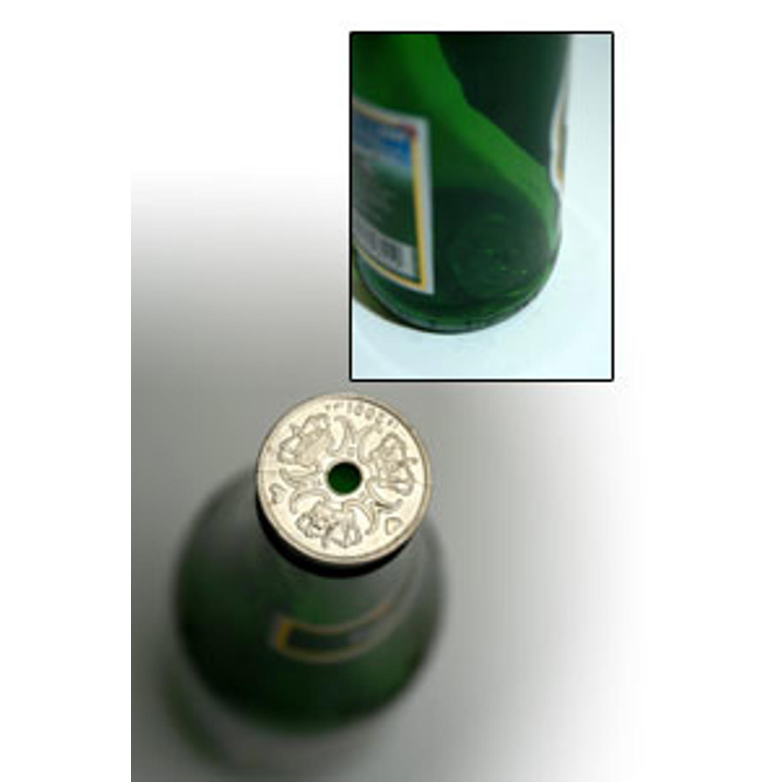 Du låner en 5-krone af en tilskuer og tager en almindelig flaske fra bordet. Du lægger mønten i den ene hånd og slår flasken ned mod den, - og i næste øjeblik ligger mønten inden i flasken! Forestil dig publikums reaktion...