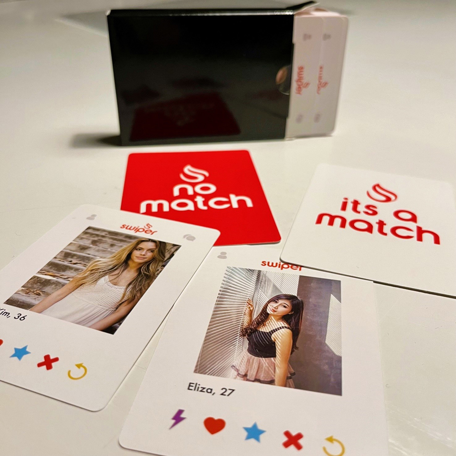 Swiper kortene kommer i en tilforladelig æske med titlen "The Offline Dating App" og indeholder 26 kort med mandlige profiler, 26 kort med kvindelige profiler og 2 særlige "perfect match" kort. Desuden får du naturligvis udførlig online undervisning af Matthew Wright (på engelsk).