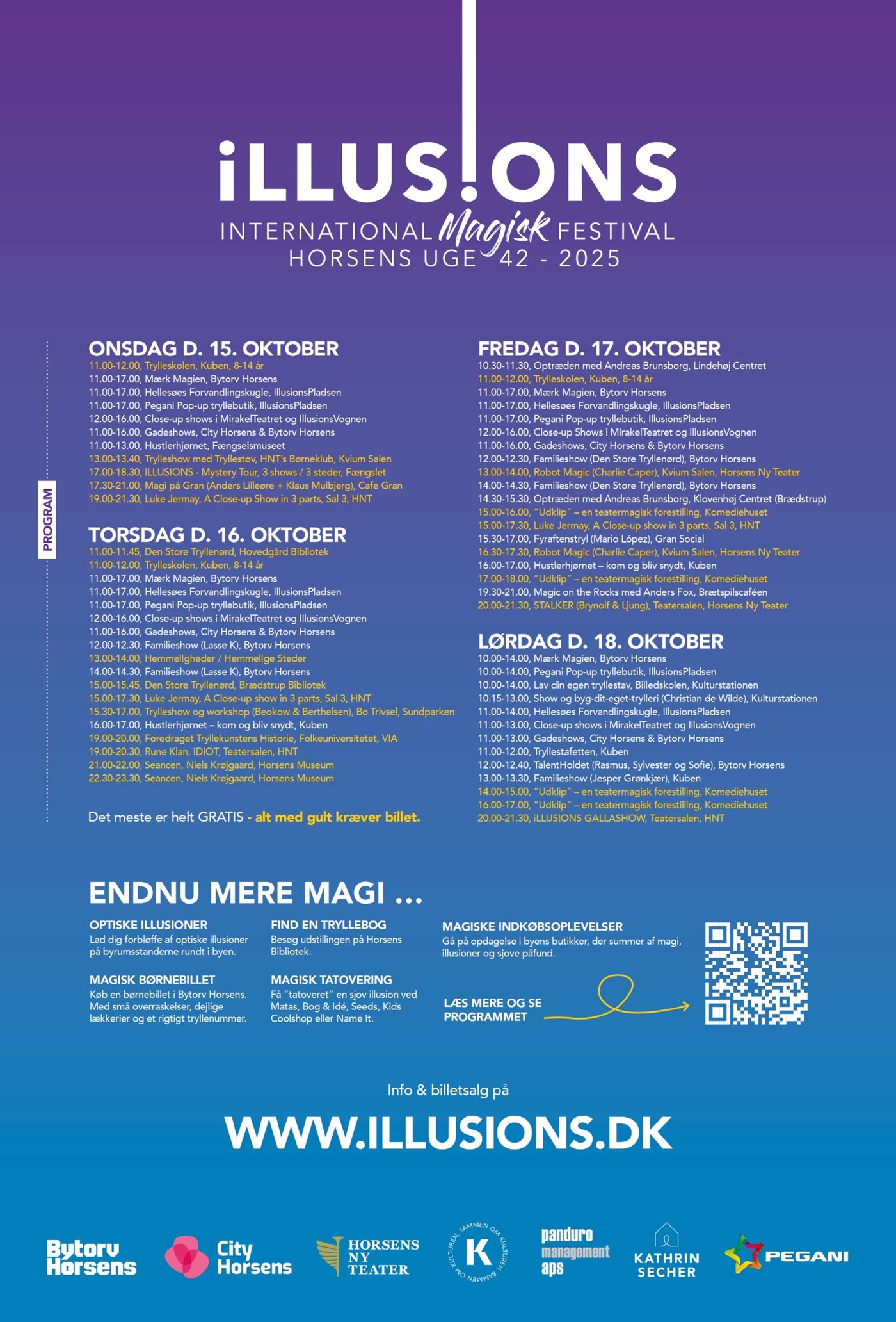 I festivaldagene er hele Horsens på den anden ende og du vil finde magi overalt. På illusions.dk kan du følge med i, hvordan festivalen præsenteres for offentligheden. Du finder hele festivalprogrammet HER - inkl. vores trylleinterne events og oversigten for publikum nedenfor. Følg også gerne med og spred god energi på de sociale medier: Instagram og Facebook og tilmeld dig vores nyhedsmail her.