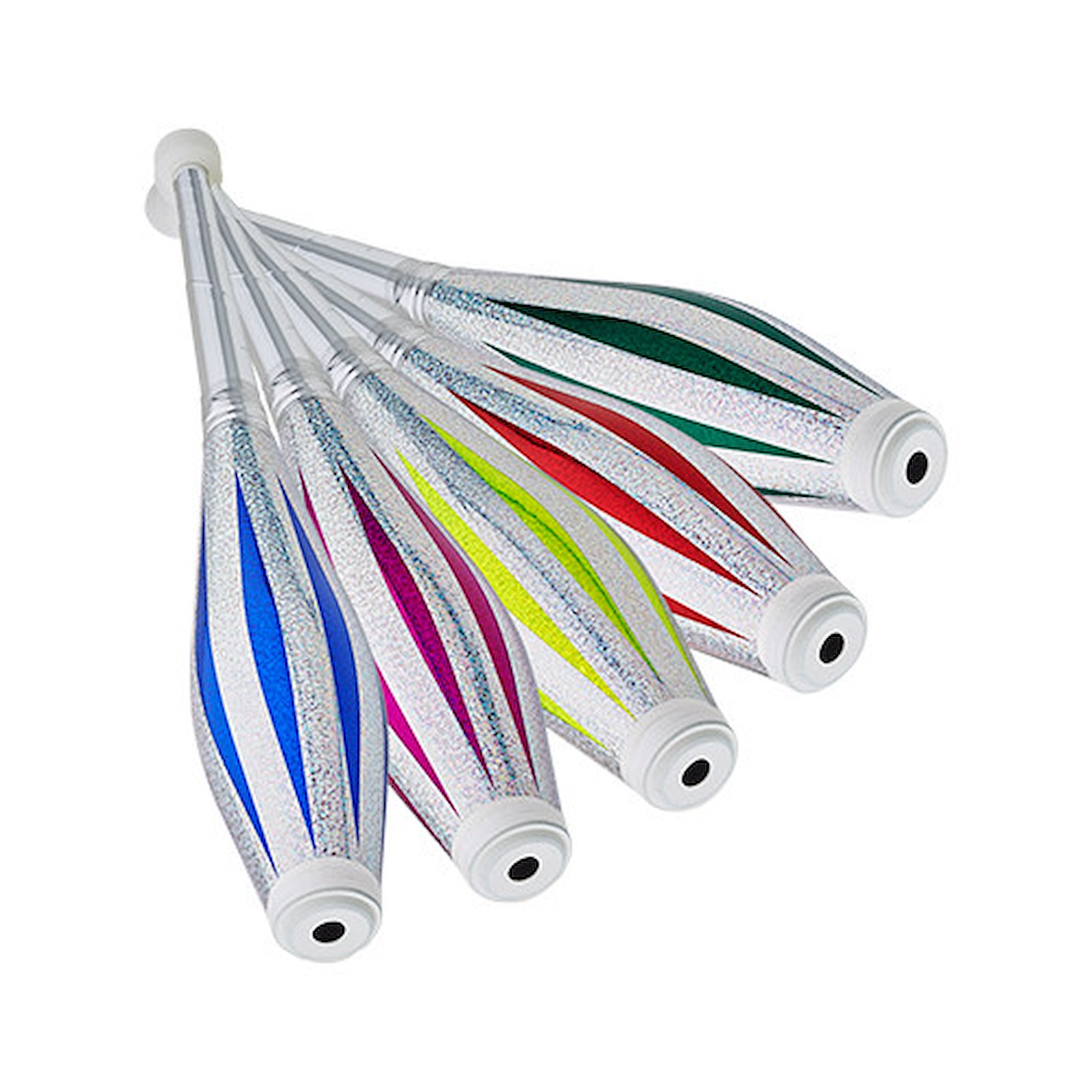 Keglen er smukt dekoreret med metallic farve og glitter-sølv eller sølv uden giltter på langs. Perfekt afbalanceret og med hvid knop og top. Er 52 cm. og vejer ca. 218 g.