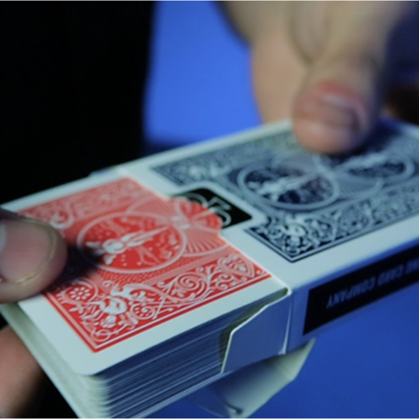 Det røde kortspil trækkes ud af æsken og en tilskuer nævner et helt vilkårligt kort. Kortet findes og vendes med bagsiden opad, og det viser sig at være det eneste BLÅ kort i hele spillet! Kortet lægges med forsiden op på æsken, mens du viser at alle de andre kort virkelig er røde. Du forklarer, at den blå farve blot har været en illusion, og med et nik opfordrer du tilskueren til at vende sit valgte kort om – det er nu også rødt på bagsiden!