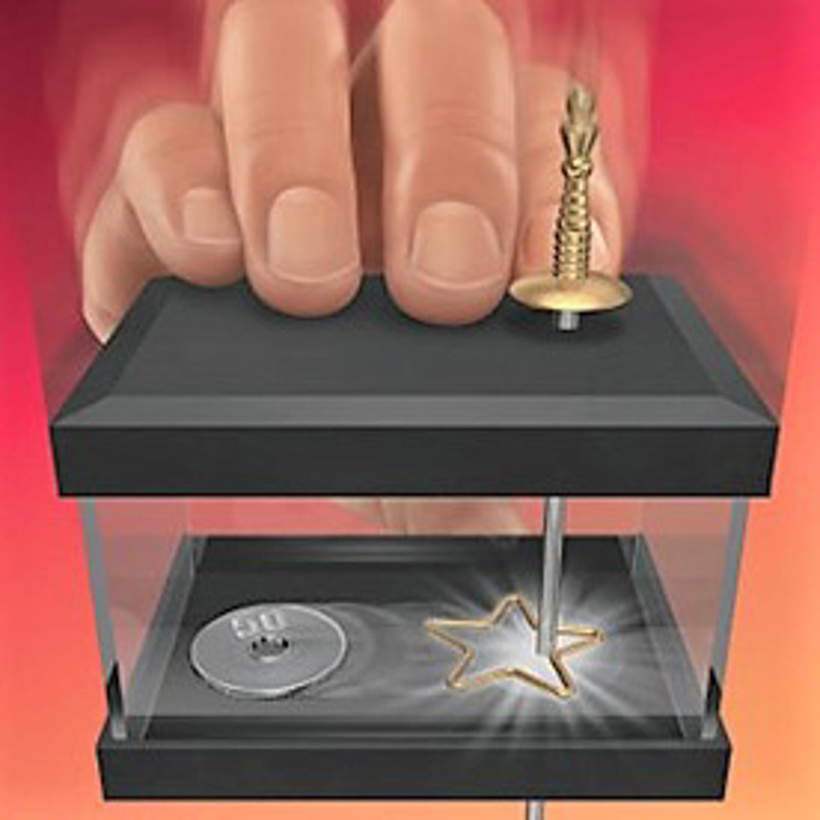 Du giver en tilskuer to genstande i hånden. En mønt med hul i midten (f.eks. en dansk eller norsk 1-krone) og en lille guldstjerne. Du beder personen om at lægge de to ting ned i en lille transparent æske og sætte låget på.
