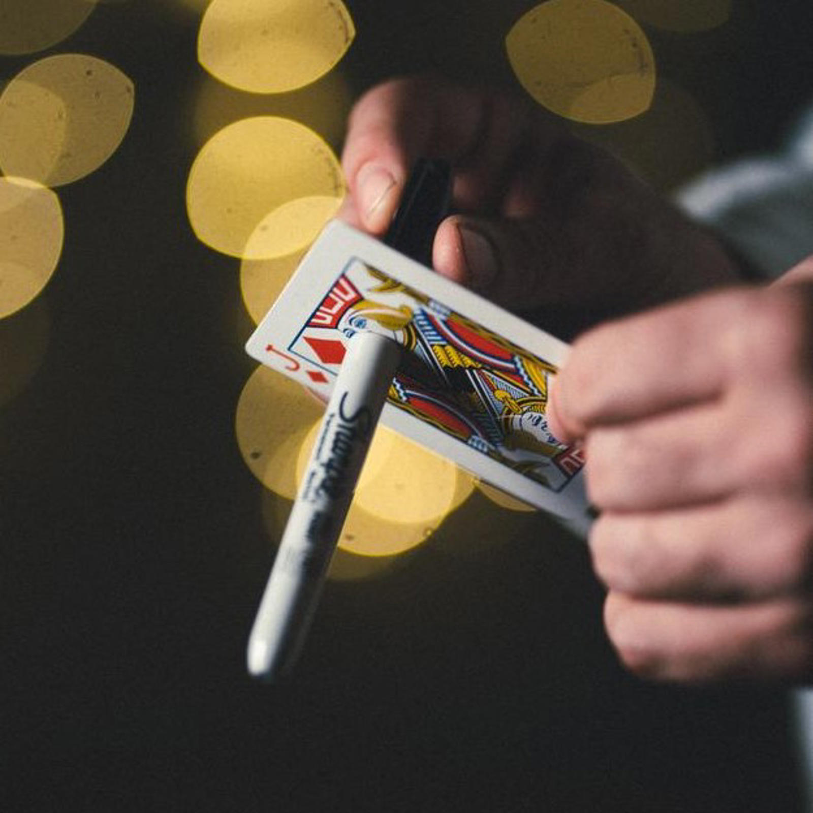 Her er redningen: vi har fået Theory 11 til at lave os en pakke med et nyt præpareret kort (Bicycle med rød bagside) og et eksemplar af den specielle sharpie-tusch.
