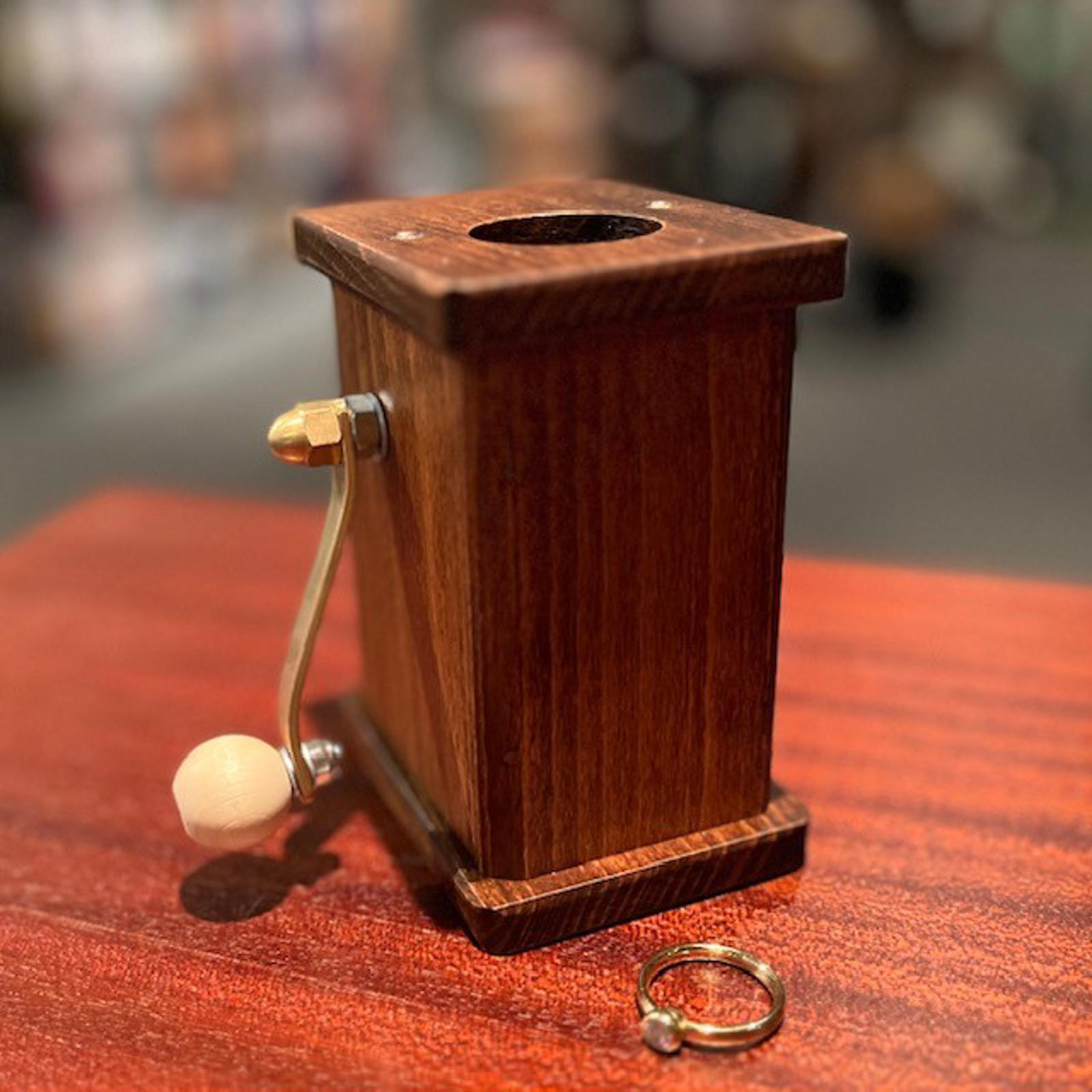 Denne nye Ring Grinder er fint fremstillet af Arsene Lupin i Polen. Den siger en høj lyd når der drejes på håndtaget og så er der indbygget en lille smart feature, så du selv vælger på stedet, om du skal hælde guld- eller sølvstøv ud af den. Man ved jo aldrig hvilken ring man låner. Kommer komplet med dansk instruktion og både guld- og sølvstøv.
