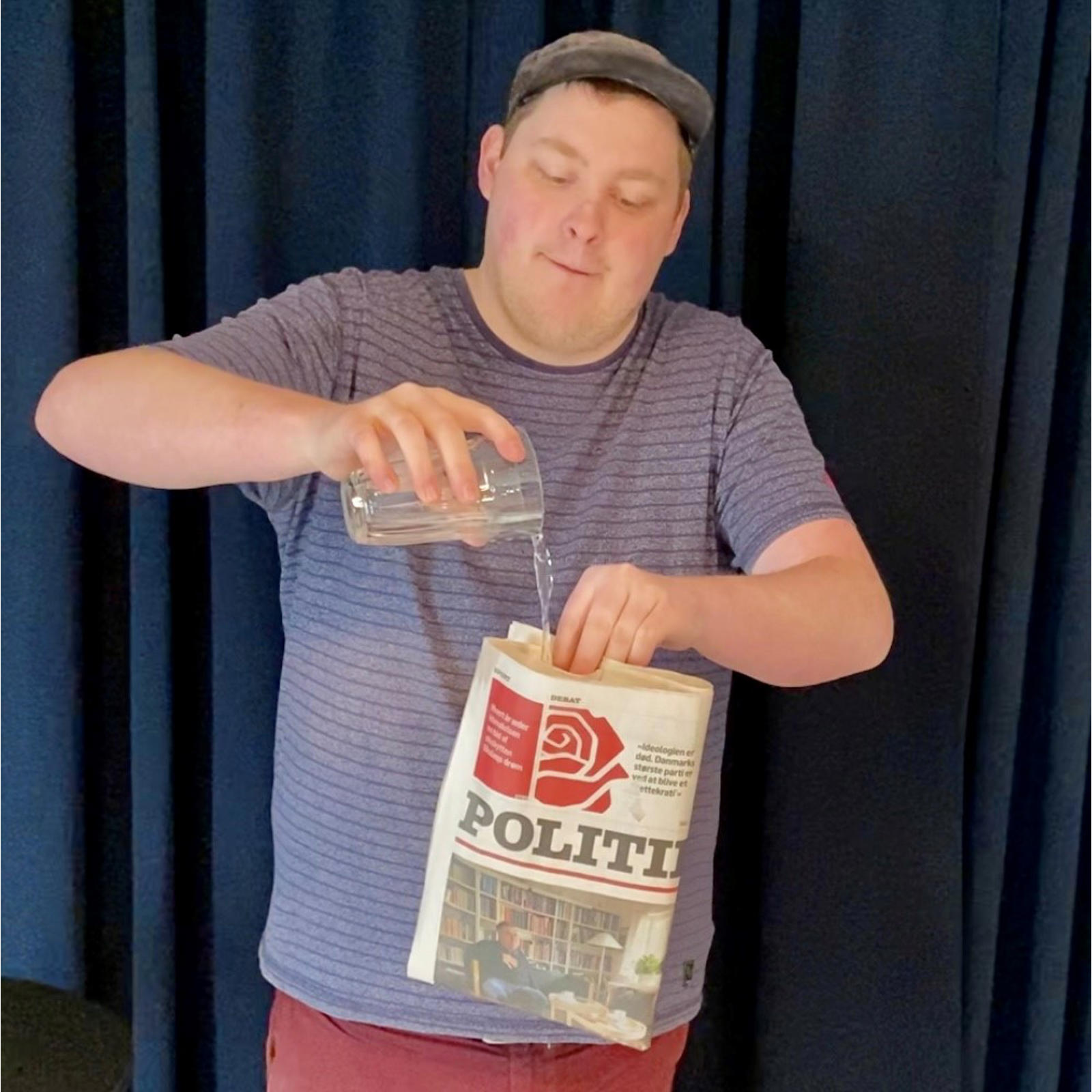Til sidst folder du igen avisen og hælder alt vandet tilbage i glasset. Det virker imponerende, men effekten er let at udføre.