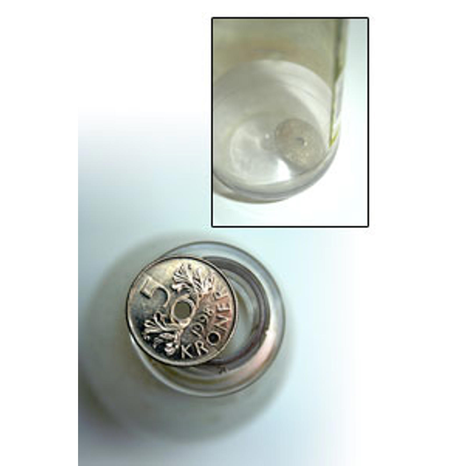 Men hvordan skal du få 5-kronen ud af flasken igen. Jo, du ryster den simpelthen ud af flaskehalsen og kan levere den tilbage til den måbende ejermand. Flasken kan du roligt stille på bordet til nærmere undersøgelse.