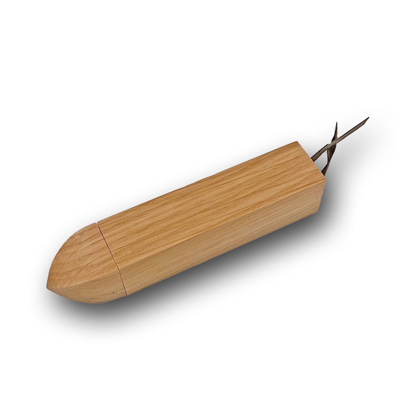Du bruger: en lille aflang træklods med et langt hul, hvor der er monteret en elastik i bunden og en pind med en krog i enden. Opgaven går nu ud på at fange elastikken nede i hullet, så pinden hænger fast.