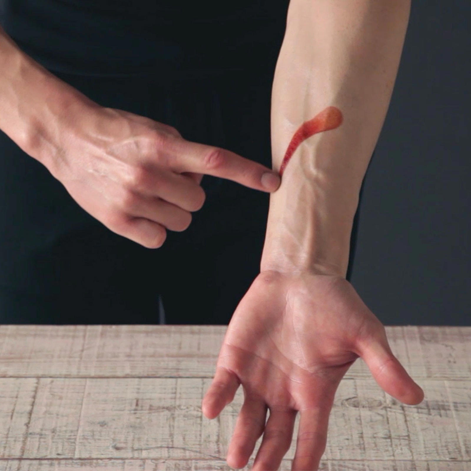 Måske spørger du til en tilskuers smertetærskel og forklarer, at du vil prøve at teste den. Du kommer et par dråber klar "trylle-creme" på armen, for at bedøve den lidt. Herefter tager du en kniv og skærer et snit henover tilskuerens arm. Det begynder straks at bløde, men tilskueren føler ingen smerte - overhoved! Og så snart blodet tørres væk, kan alle ånde lettede op, armen er helt uskadt.