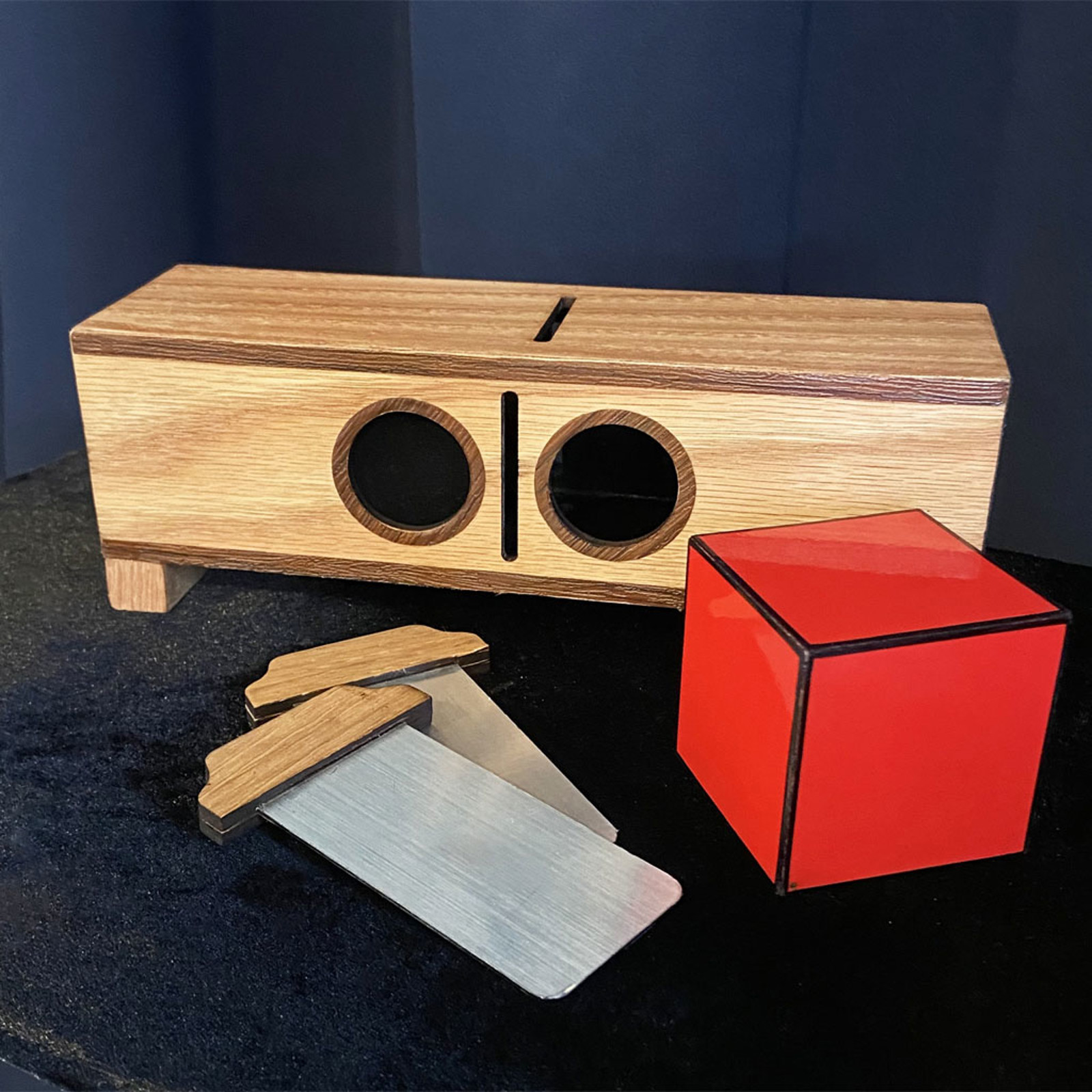 Du viser en tom cylinder med et par huller foran, en solid rød terning og to små klinger. Du spærrer midten af røret med et par klinger - og nu til magien: Den røde terning skubbes ind i den ene side af røret, indtil den stoppes af metalklingerne. Du mumler et par magiske ord, og dine tilskuere ser med vantro hvordan terningen langsomt trænger lige igennem klingerne og ud på den anden side!