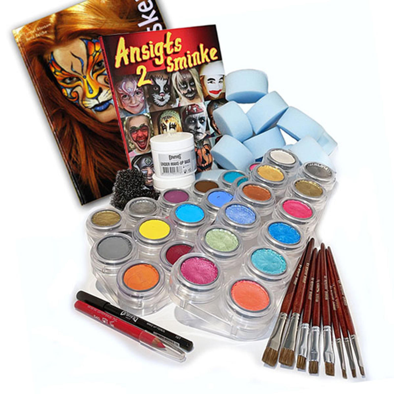 En komplet pakke af farver og redskaber der skal bruges for at lave flotte ansigter. Med den medfølger der to inspirationsbøger. Janus Vinther Ansigtssminke 2 med 82 forskellige trin-for-trin fotos af ansigtssminke og Carmel Bloxsom og Rene' Reiche sminke bog Kreative fantasi masker. De flotte fotos viser trin-for-trin, hvordan du laver maskerne og hvilken farver og redskaber, du kan bruge til hver enkel.
