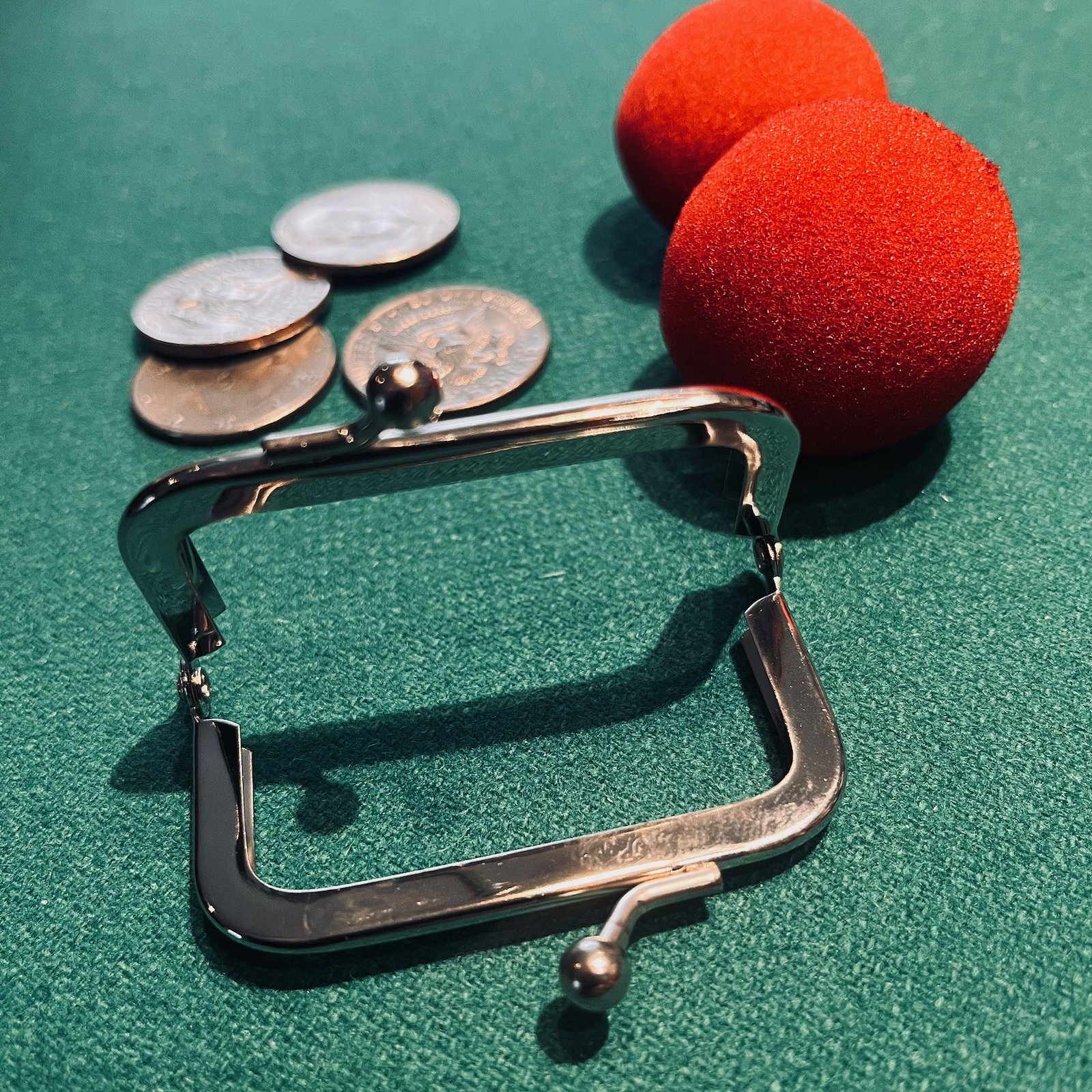 “The frame of a purse. An old Albert Goshman idea that is still popular. You open your transparent wallet and magically produce, for example, coins, sponge balls, a folded card, or a prediction. Comes without instructions (or contents).