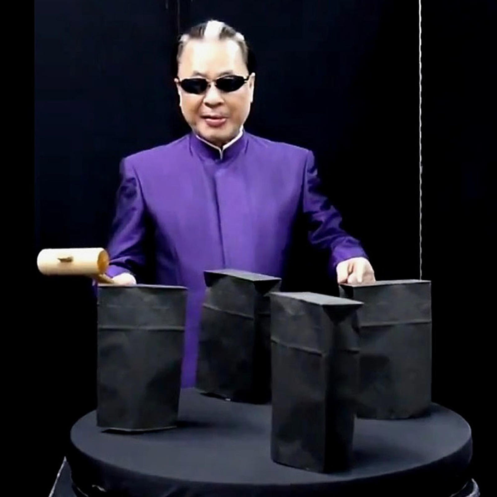 The magician pours water into one of several glasses and then each is covered with a paper bag.