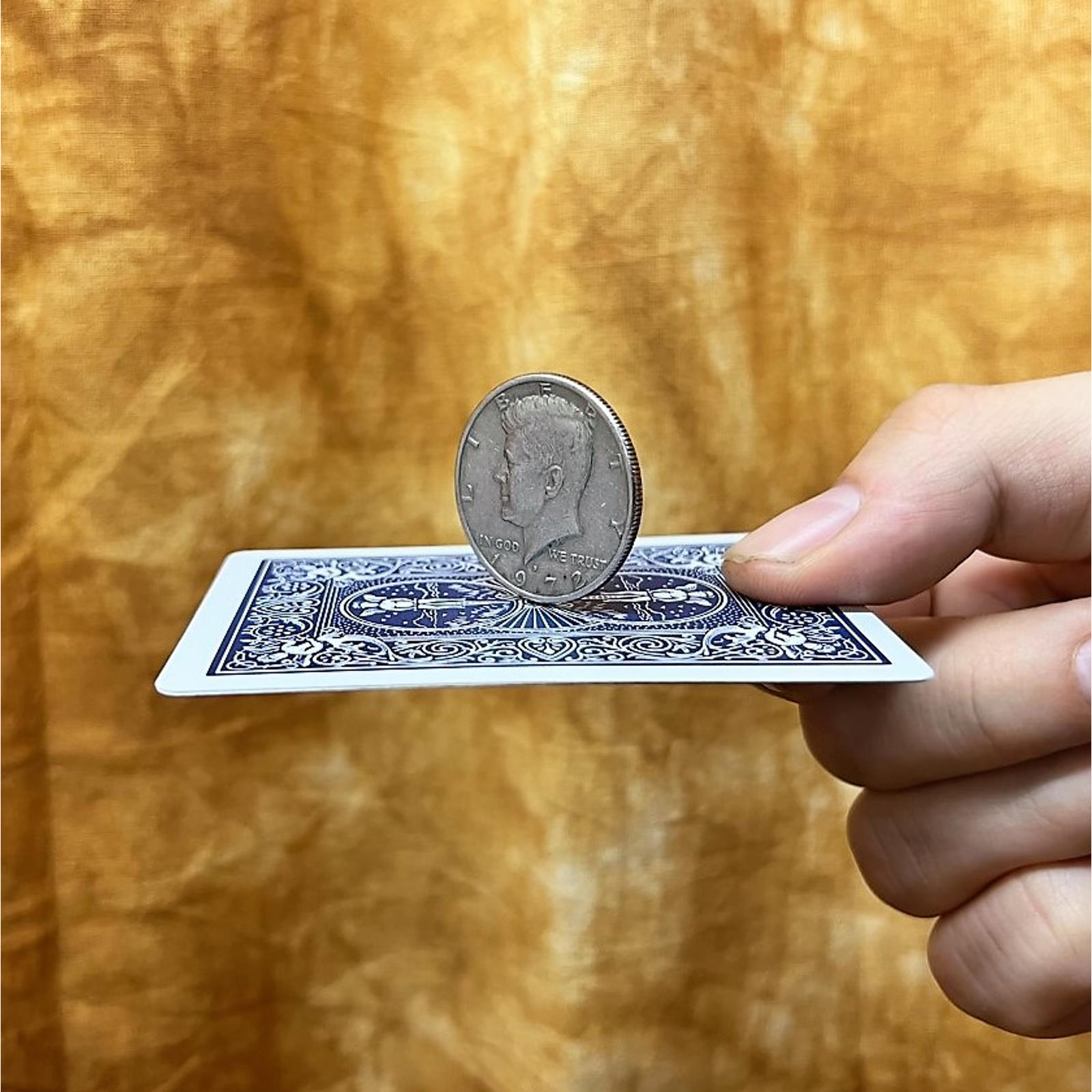 The performer shows an ordinary half dollar and places it on a playing card. Unbelievably, the coin begins to move by itself. It rises up from the card and stands on its edge. It twists and turns before returning to its original position on the card. Now also available in "The Dead Edition".