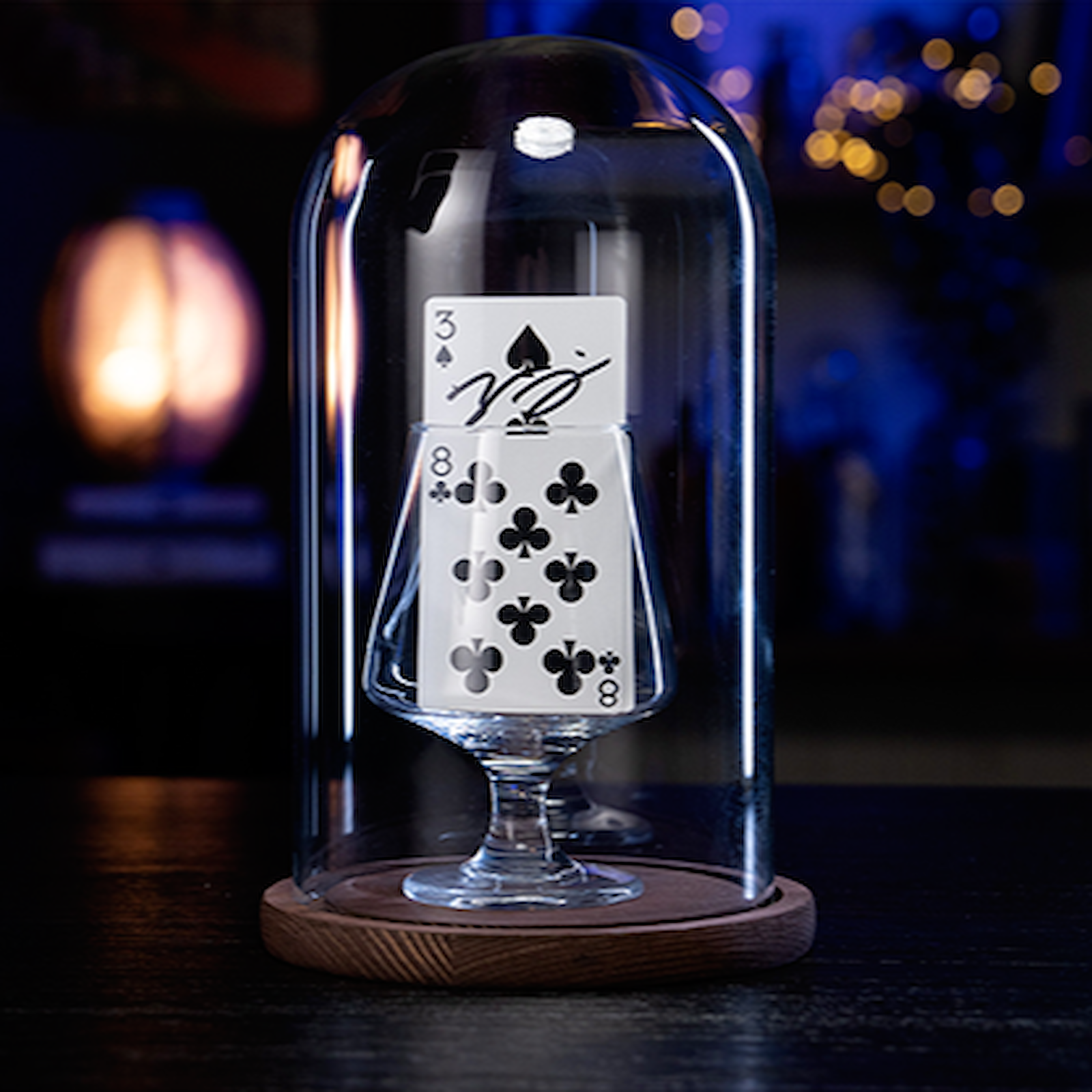 A spectator selects a card from a deck. It’s lost in the middle. The deck is then set aside in a glass. The class is covered in a glass dome. Yet, at your command their chosen card rises! . Parlor Rising Card Set comes with everything, including the beautiful wooden stand, the glass dome, and a glass that is made to perfectly fit your deck.