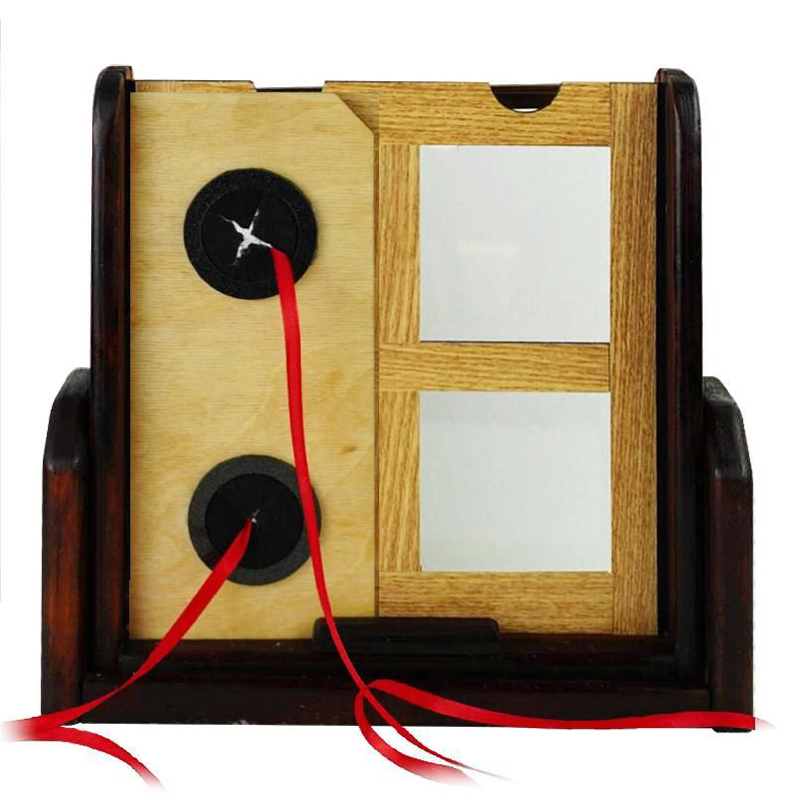 A wooden frame with four windows is displayed. Each glass panel is tapped with the neddle, proven to be solid. Now, two windows are covered with a panel in front and in the back. The rod with a length of ribbon attached is then pushed right through the holes in the middle, apparently penetrating the glass! The rod and the panels are then removed, showing that the glass to be unharmed and still perfectly solid.
