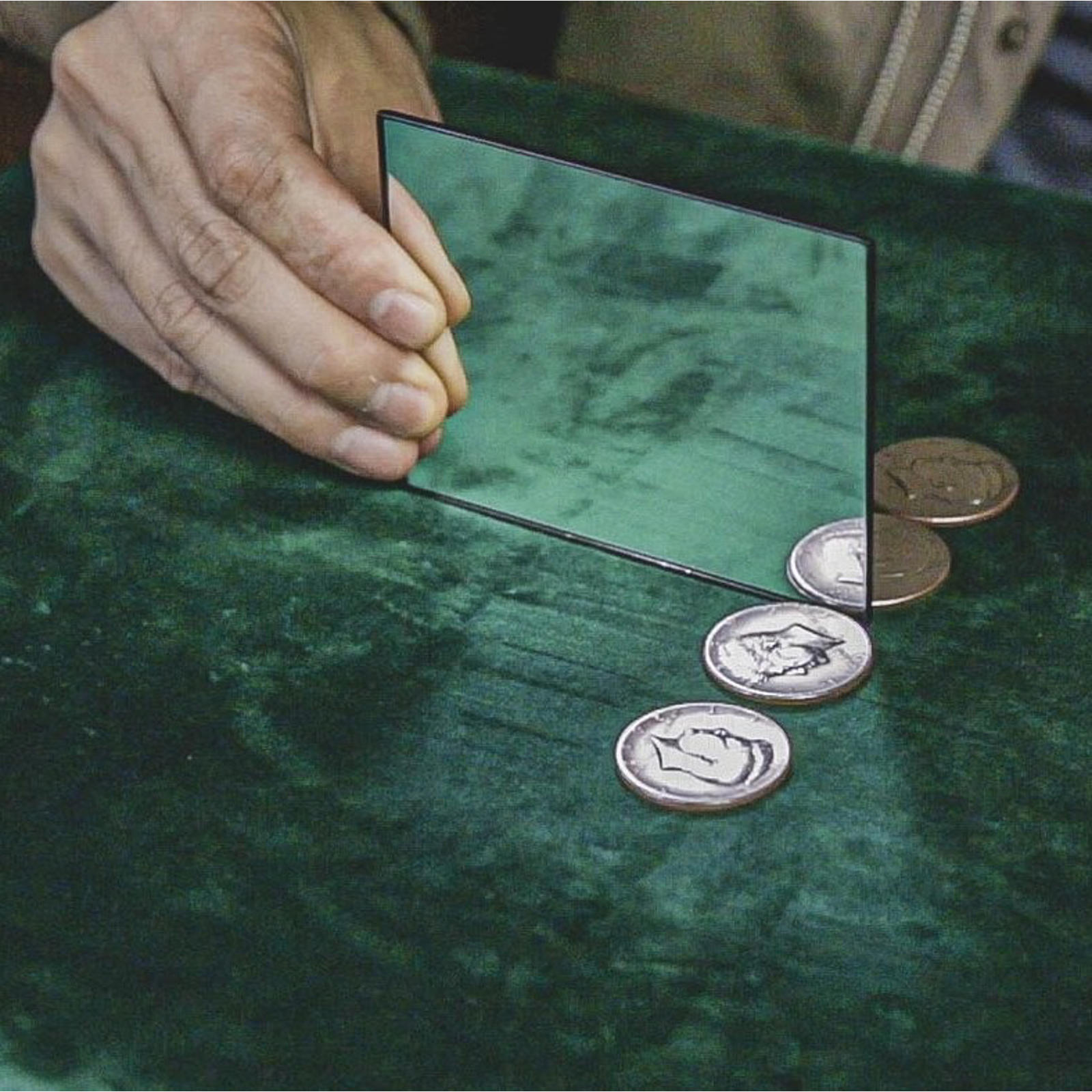 It is an unparalleled close-up discovery that transports an innocent half dollar into the twilight zone of its own mirrored reflection. While in this dimension the coin is visibly condensed, dematerialized, recreated, and reproduced-building to the spectacular "Twilight" finale in which the mirror's reflected images are instantly transformed into four genuine half dollars!