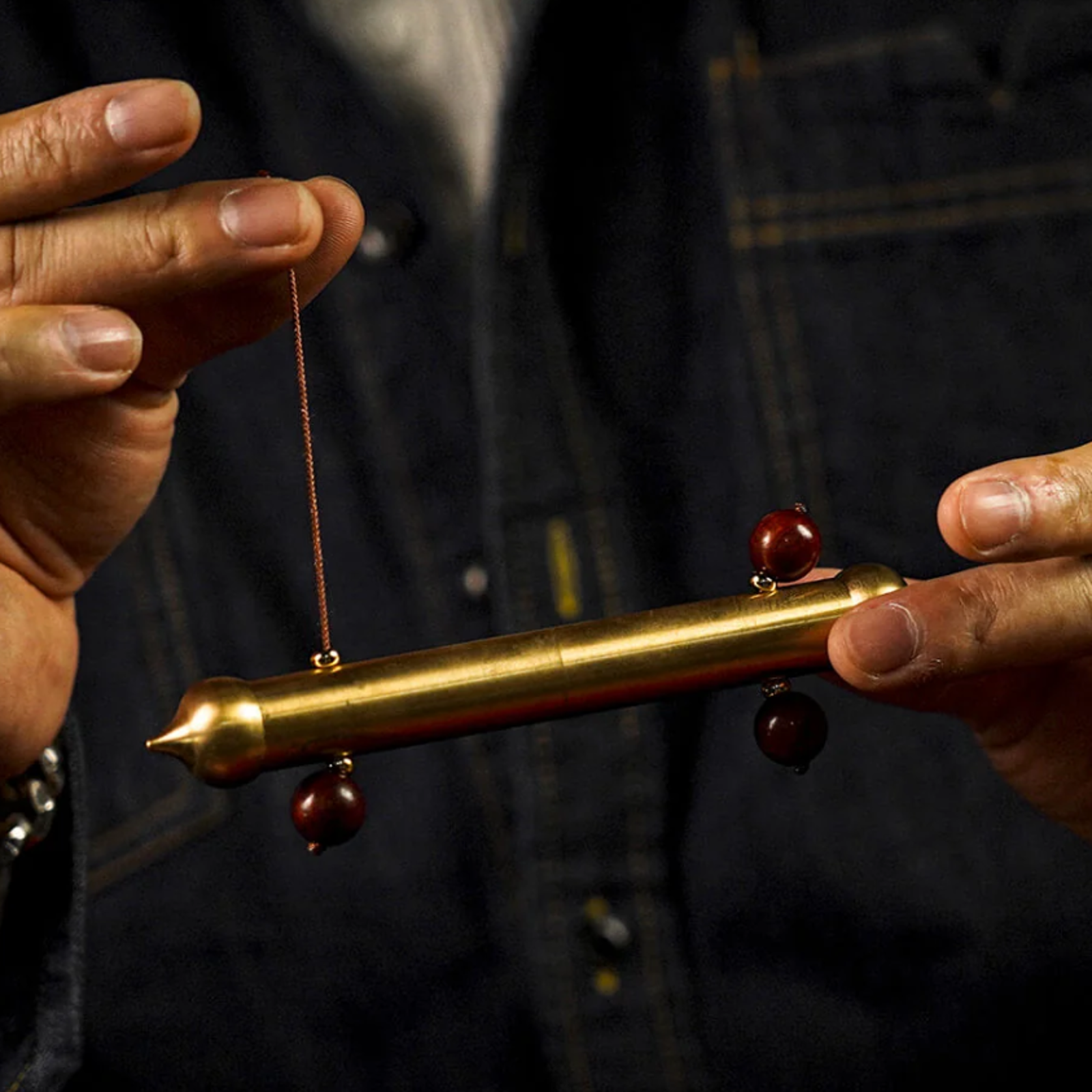 This modern version features a brass stick measuring 13.5 cm in length, with four wooden beads attached to each end, one of which is hanging on a cord. When you pull a bead on one side, the hanging bead is retracted, and when you pull a bead on the other side, the hanging one remains retracted. This process is repeated in various combinations, giving the illusion that all the beads are connected.