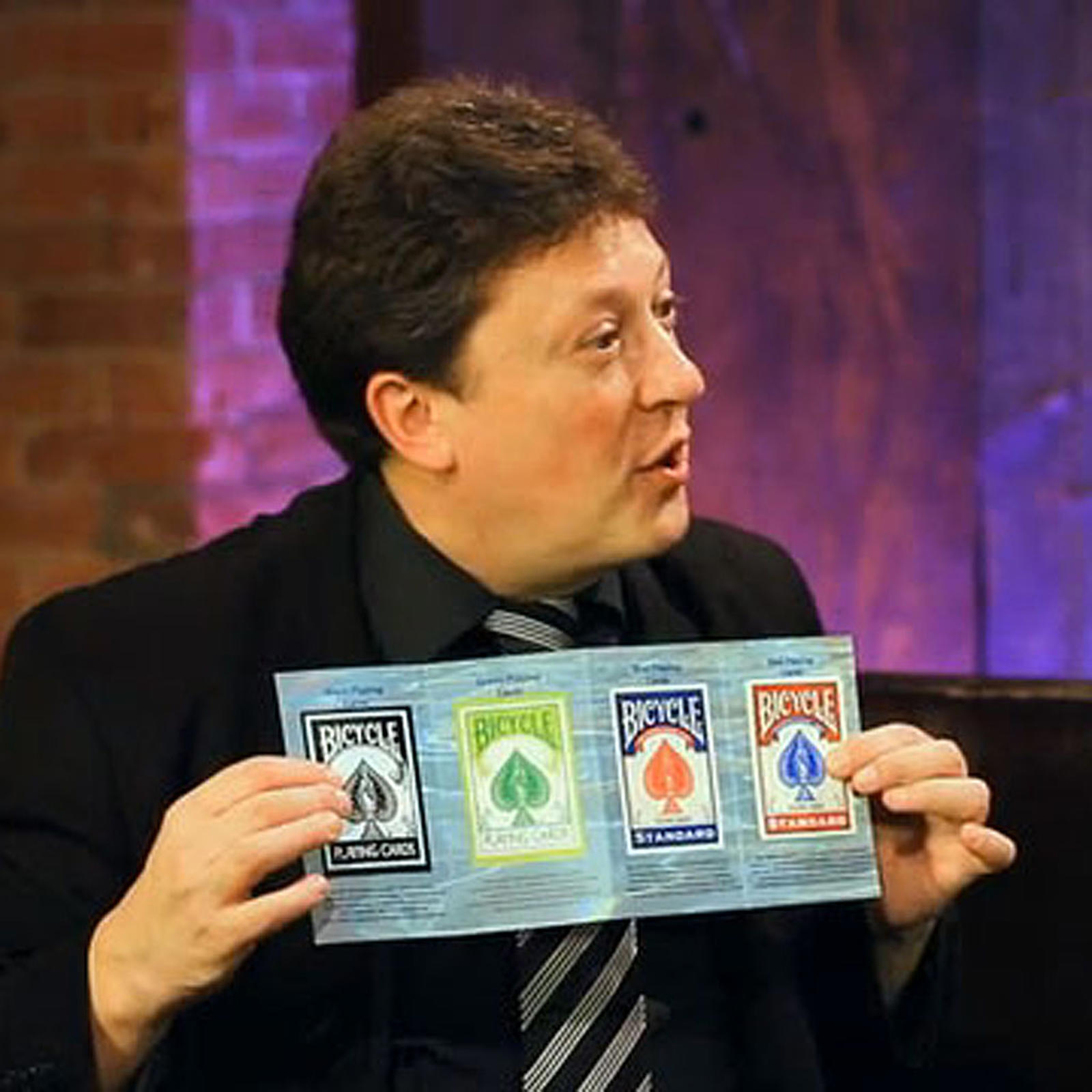 The magician showcases a catalog of different colored deck of cards. With a little shake of the catalog, a deck of cards falls from the catalog and is ready to be used by the magician.