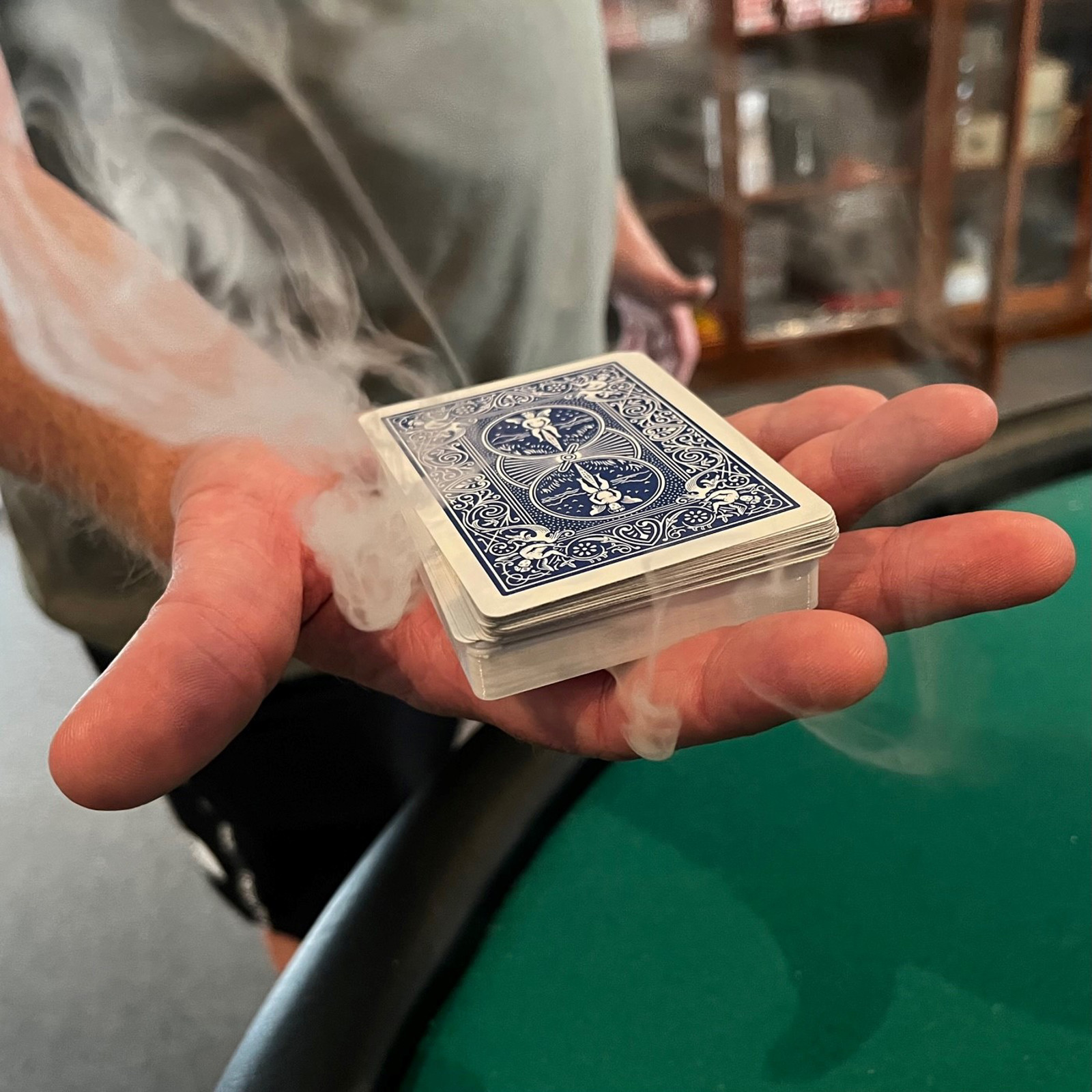 HAZE from Wonder Makers is a small and effective smoking device, built into a block that looks like half a deck of playing cards. This means that you do not have to hide HAZE, it can even be handed out and you can get that very magically moment, where the deck starts to smoke while a spectator is holding it.