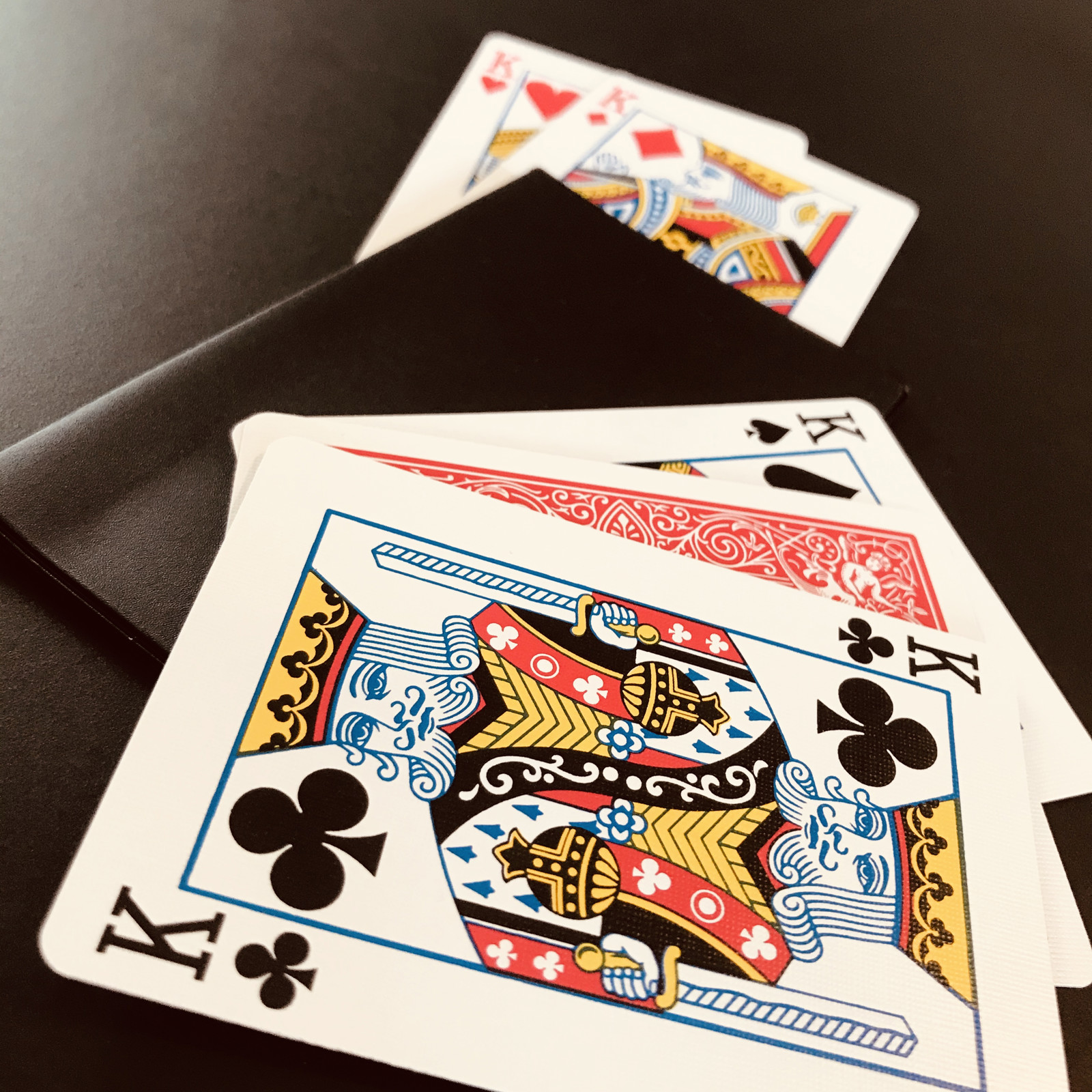 The signed card is placed face down between the two red kings, while the black kings are momentarily put aside.