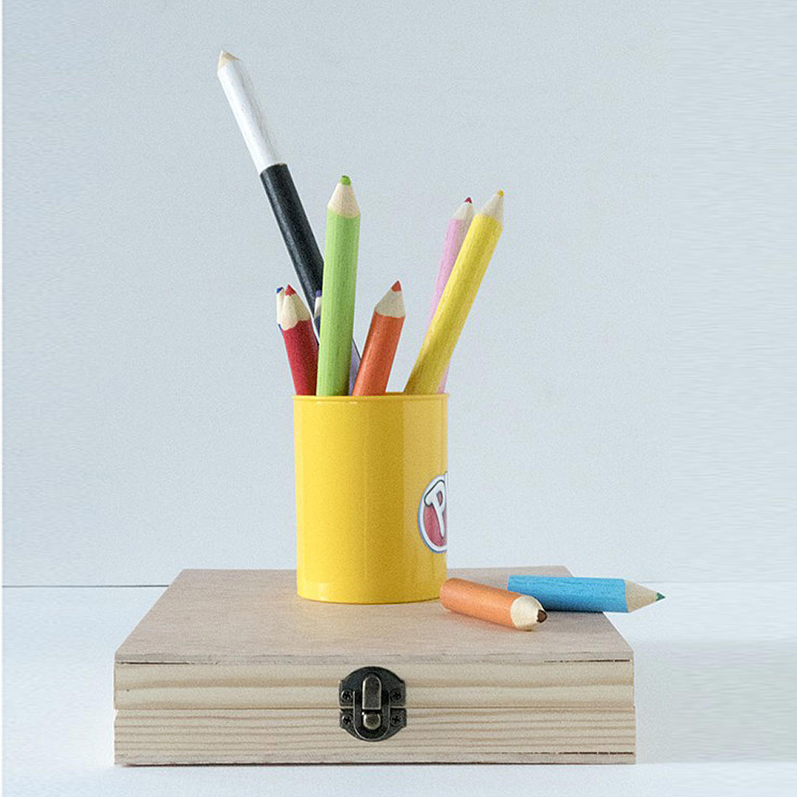 You open the box to show large colour pencils in different lenghts. You empty the pencils into a can and out of the large black and the two smaller white and grey pencils, you form something that looks like a magic wand. Inspired by that, but put something into the box - perhaps a black/white drawing. You close the box, wave the magic wand, and when the box is opened again, you can take out a drawing with colours!