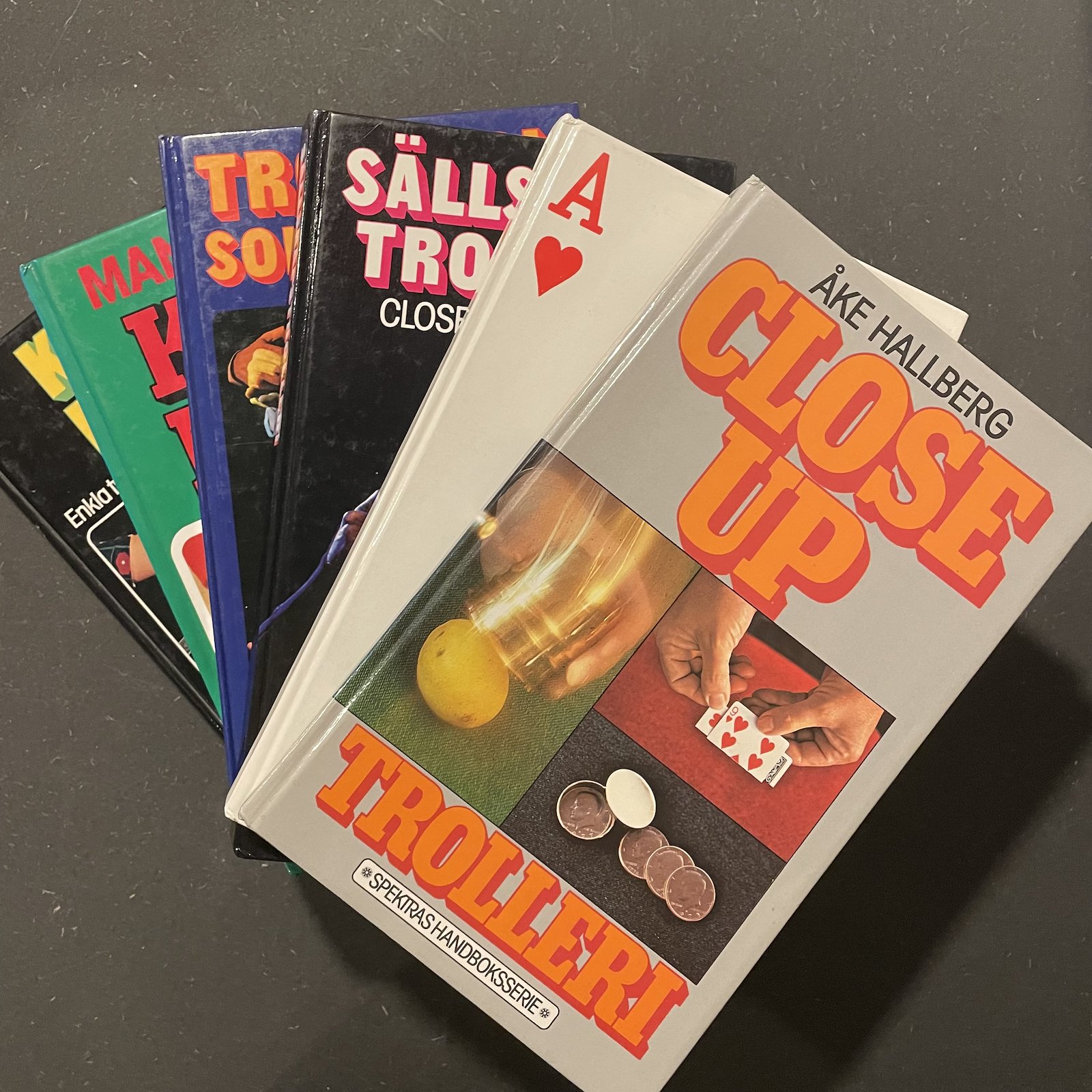 Second-hand. CONDITION: quite good. 6 Swedish books: Sällskaps trolleri, Close up trolleri, Kort magi, Manipulativ kort magi, Trolleri som hobby og Magiska Kuperingar Grepp och FalskRäkningar- Published 1978-1984 by Åke Hallberg and Spektra.