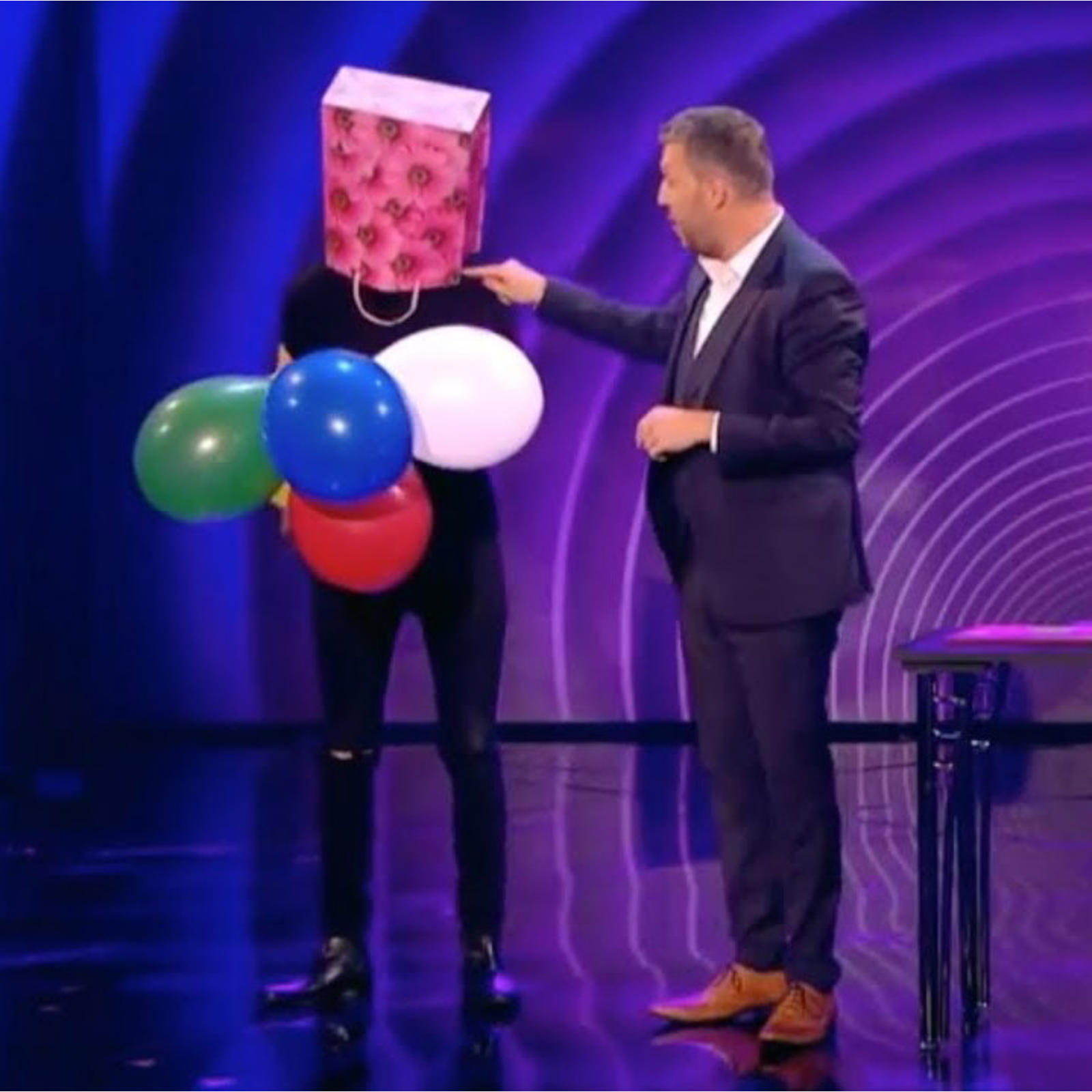 A large paper bag is placed over his head, so that he cannot see what colour he will burst. In order to not see what is going on, you also wear a similar bag on your head. You place yourself and the spectator back to back and the show can begin.