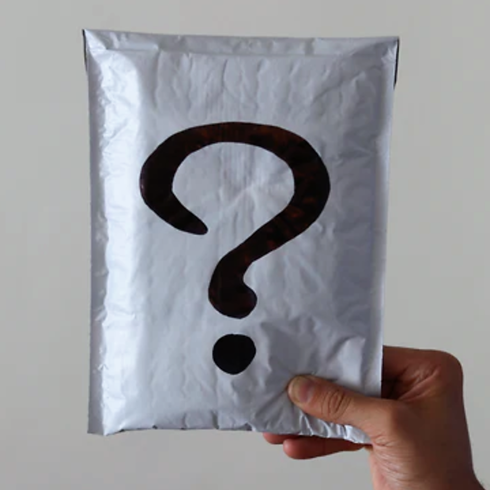 Outer question mark white envelope measures 16,5 x 23 cm.. Final reveal card when unfolded is 13 x 18 cm..