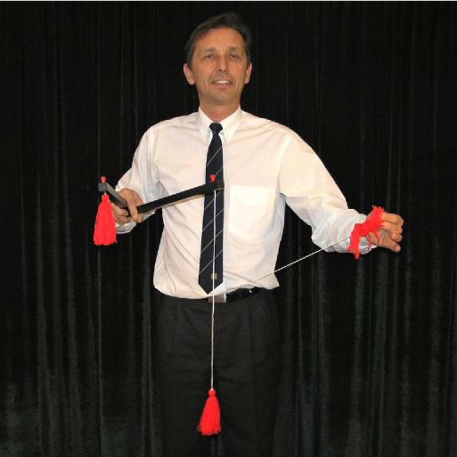 This is a classic item that goes very well with rapid fire humorous patter. In effect, the performer shows two large sticks. Each stick has got a through and through hole at one end; through this hole is running a string. One end of each string terminates into a plastic bead, while at the other end is fixed a red tassel. Both the sticks are also hollow. At the beginning one string is inside the stick, tassel appears close to the hole. Other string with tassel is running outside the stick. Holding two sticks at v-shape in his hand as the performer pulls the tassel appearing close to the hole of a stick outward, tassel fixed to the other string is pulled back towards the hole inside the second stick and this business is alternatively repeated causing fun to the audience. Finally holding the two sticks separately performer repeats above business several times, proving that there is no link between two strings and that causes great surprise to the audience.